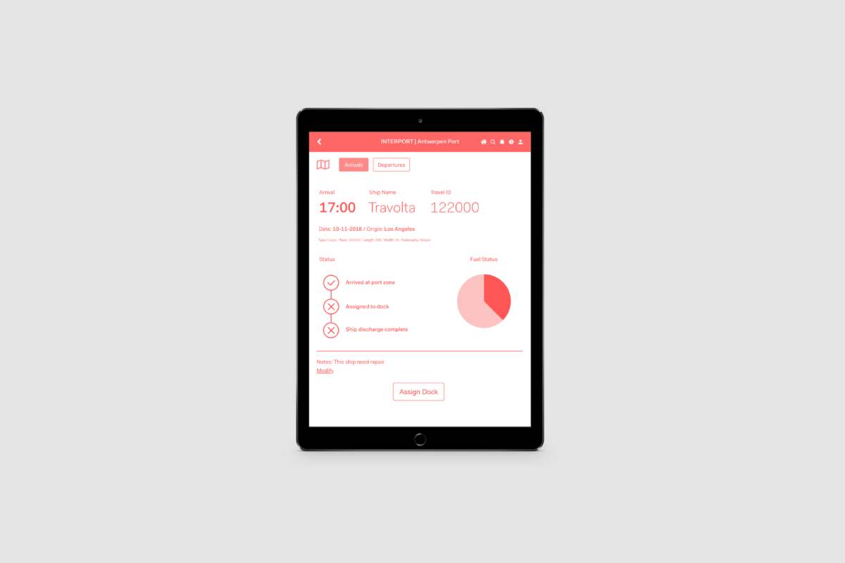 Within the Antwerp port, extensive logistical systems, networks, and operations have been created over time. Immense infrastructures have been built, where growth has been the main driver of change. To improve current systems and infrastructure to make them sustainable and efficient in the broadest sense, we made an app for the port agents, were data is shared in real-time between partners ports.